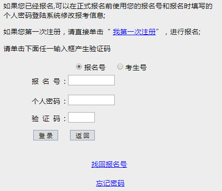 如果您已經(jīng)報(bào)名,可以在正式報(bào)名前使用您的報(bào)名號(hào)和報(bào)名時(shí)填寫(xiě)的個(gè)人密碼登陸系統(tǒng)修改報(bào)考信息;