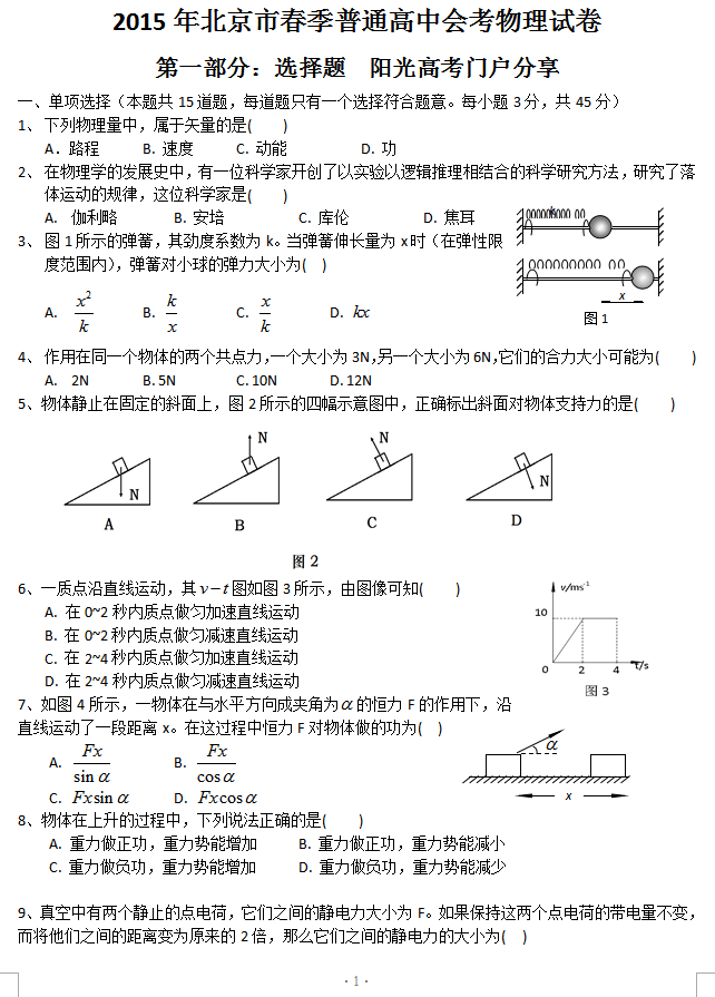 北京市2015年高中春季會(huì)考物理試題及答案