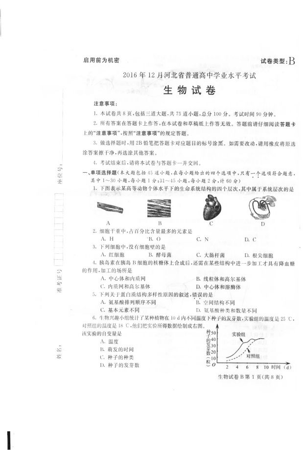 河北省2016年12月普通高中學(xué)業(yè)水平考試生物試題