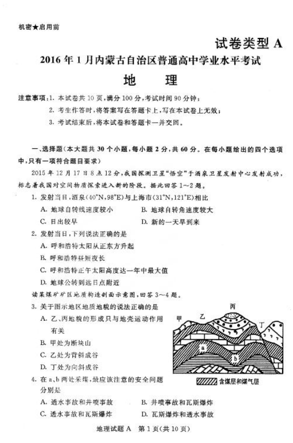 內(nèi)蒙古自治區(qū)2016年1月普通高中學(xué)業(yè)水平考試地理試題及答案