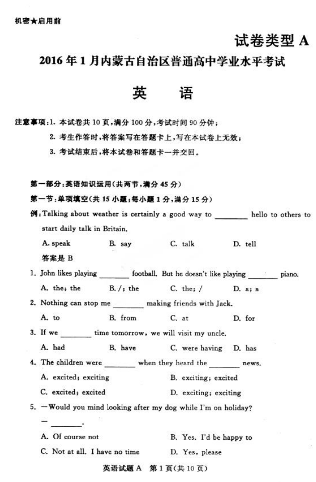 內(nèi)蒙古2016年1月普通高中學業(yè)水平考試英語試題及答案